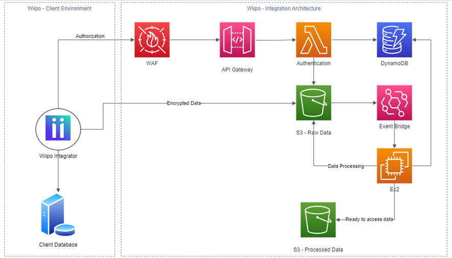 O primeiro desafio desse fluxo foi montar uma estrutura capaz de processar as informações de folha de maneira escalável. Para a etapa de coleta de informações, a solução conta com um elemento importante, o Integrador Wiipo. Este é um componente externo que é instalado e executado em conjunto com o sistema de folha do cliente (on-premises ou nuvem). O integrador realiza o envio de mais de 370GB/mês de informações para o ambiente AWS da Wiipo.