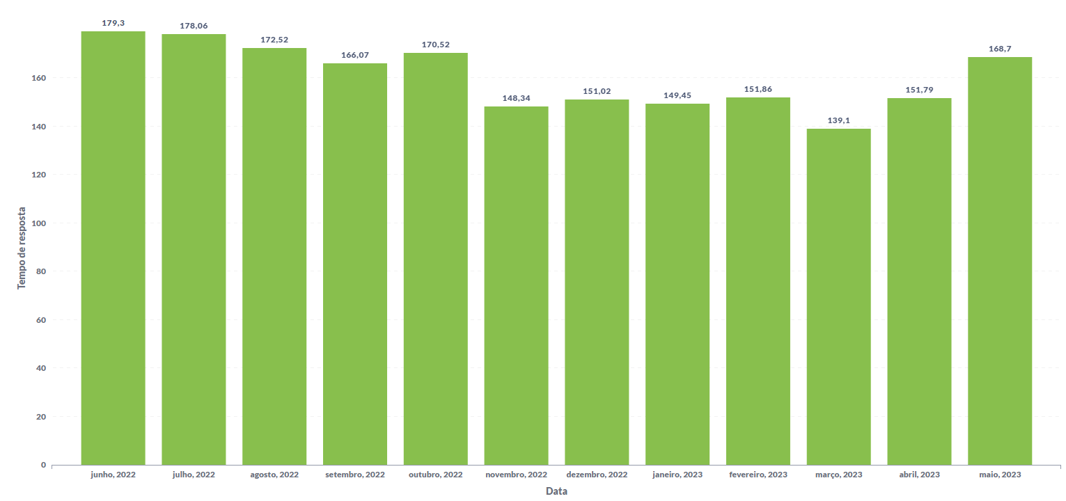 Além da capacidade de atender a demanda de volume, a arquitetura permite manter uma latência baixa. Mesmo em momentos de maior acesso, onde são recebidas mais de 120 requisições por segundo, o serviço mantém tempos de resposta abaixo de 200 ms, conforme a Figura 4.
