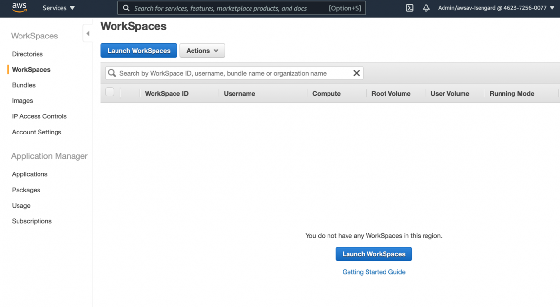 2- Clique na aba WorkSpaces, e logo após clique em Launch WorkSpaces: