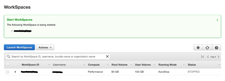 24- Selecione o WorkSpace, clique em Actions e em seguida clique em Start Workspaces