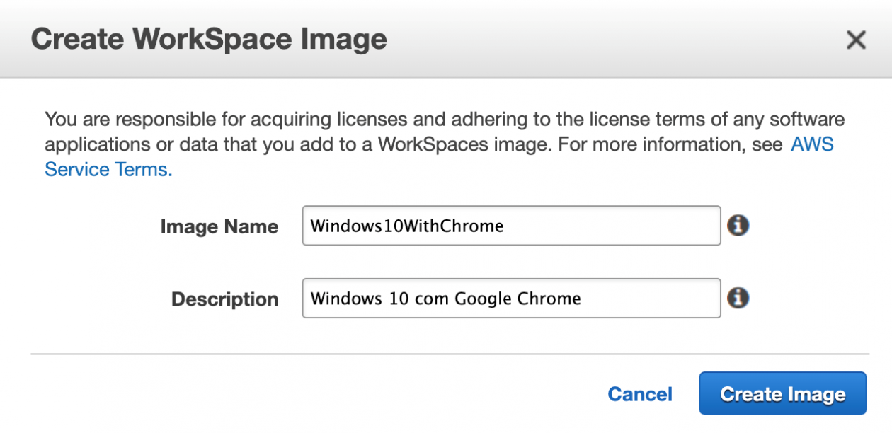27- Preencha o nome da imagem e a descrição, conforme exemplo abaixo, e clique em Create Image: