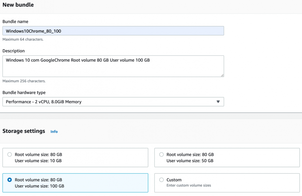31- Informe o Bundle name, Description, Bundle hardware type e Storage settings: