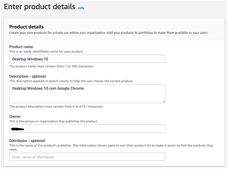 40- Preencha os campos Product Name, Description e Owner (como no exemplo a seguir, mas com os seus respectivos valores)