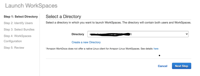 3- No passo 1, selecione o Diretório criado através do AWS Directory Services, e clique em Next Step: