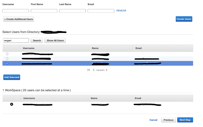 4- No passo 2, crie ou pesquise algum usuário já existente no seu domínio (somente usuários com First Name, Last Name e Email preenchidos são elegíveis para essa configuração):