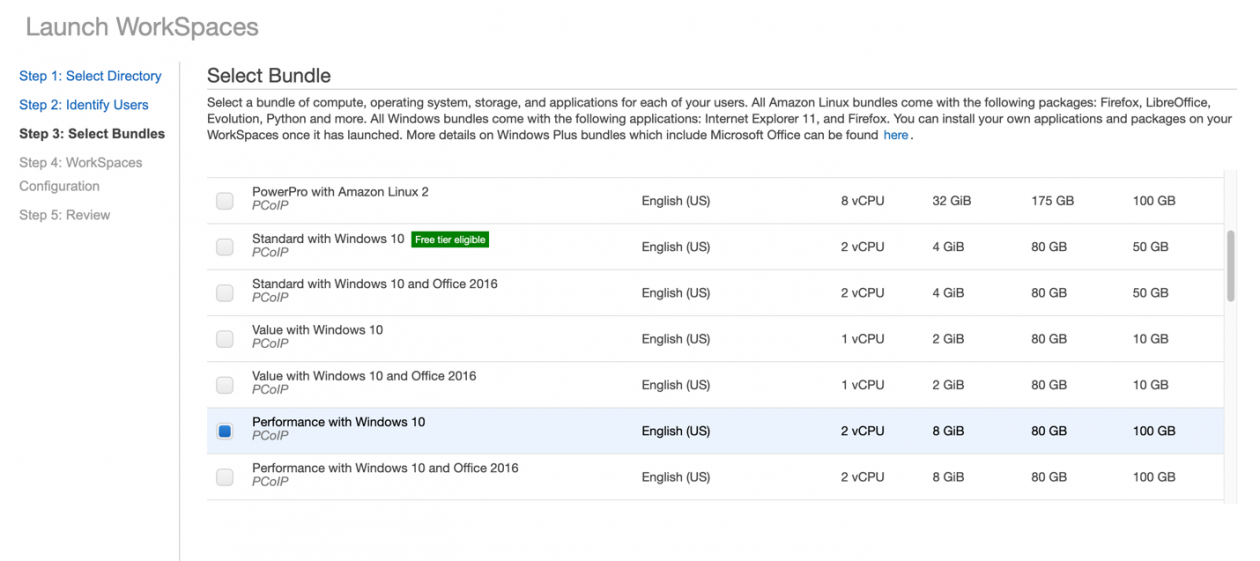 Com isso, a partir do WorkSpaces é possível criar imagens específicas para os diferentes perfis de usuários (usuários de BI, desenvolvedores, prestadores de serviço, etc) disponibilizando somente os recursos (software e ferramentas) que eles necessitam para executarem os seus trabalhos e associando essas imagens a recursos computacionais (quantidade de vCPUs e espaço em disco), gerando um bundle. Um WorkSpace bundle é uma combinação de um sistema operacional e recursos de armazenamento, computação e software. Ao iniciar um WorkSpace, você seleciona o pacote que atende às suas necessidades. E a partir do Service Catalog é possível importar um template de CloudFormation que utilizará esse bundle, disponibilizando esse provisionamento como um produto dentro do catálogo de serviços.