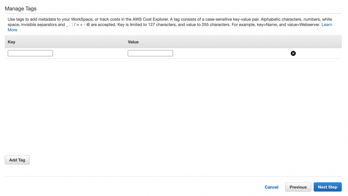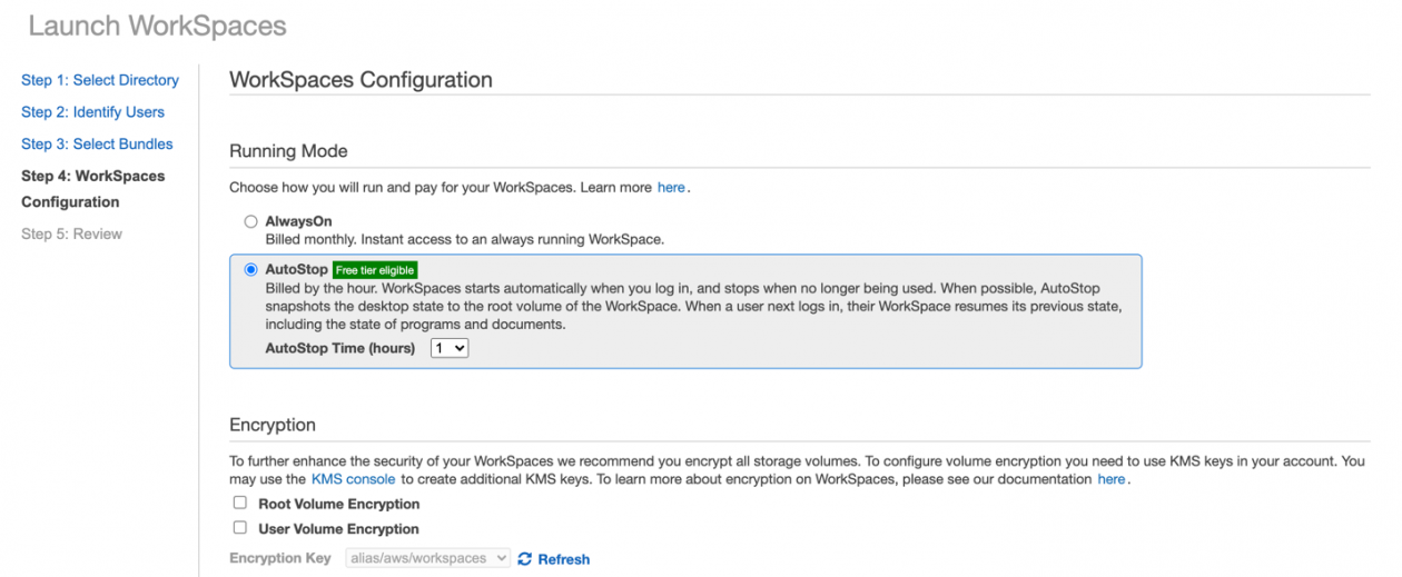 8- No passo 4, selecione o Running Mode e o Encryption (nesse momento, vamos deixar sem criptografia para que possamos gerar uma imagem do WorkSpace. Atualmente, não é possível gerar uma imagem a partir de WorkSpaces com discos criptografados):