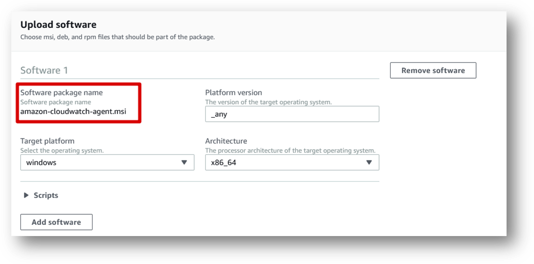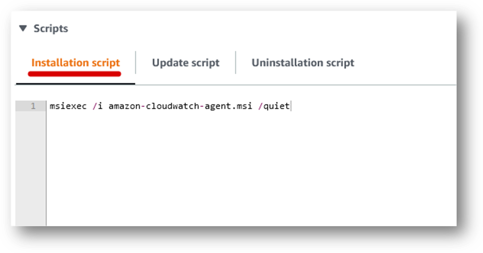 Nesta seção há um ponto muito interessante, que é a possibilidade de customizar scripts para execução em conjunto com a sua instalação. Por padrão, ele traz a instrução msiexec /i amazon-cloudwatch-agent.msi /quiet como script de instalação padrão, e a instrução msiexec /x amazon-cloudwatch-agent.msi /quiet como script de desinstalação. Você pode customizar isso, de acordo com a suportabilidade do software que você está utilizando, e até mesmo com instruções via batch script ou PowerShell. Consulta a documentação de cada produto para saber mais.