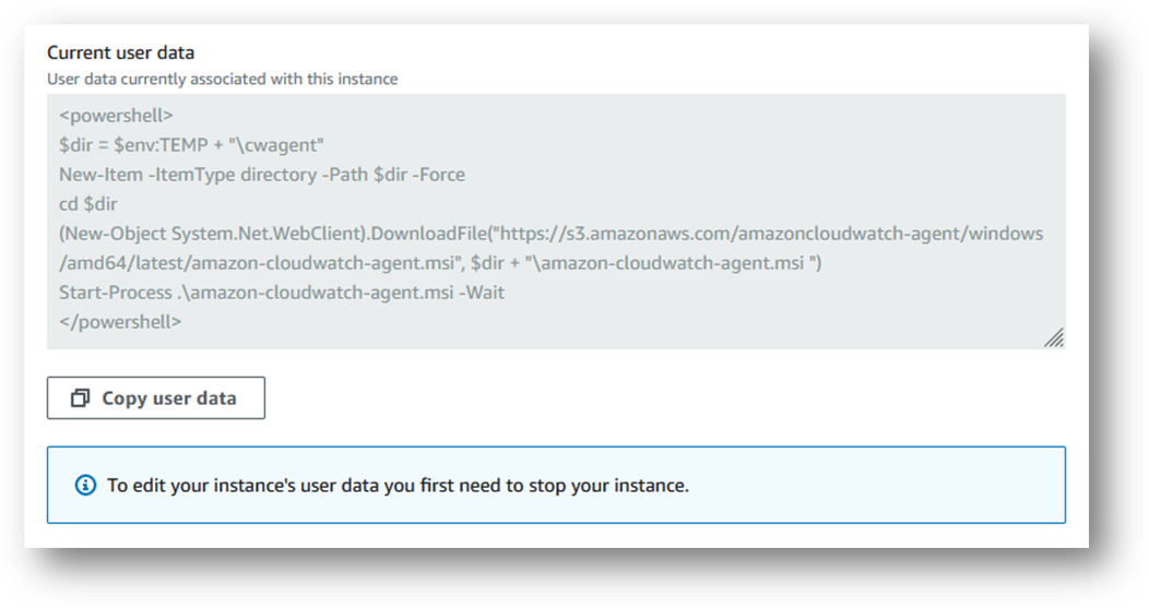 Abaixo, um exemplo de um script utilizando a tag <powershell>, com a automação da instalação do agente do Amazon CloudWatch.