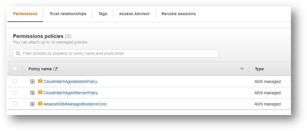 Escolhemos uma política específica para o SSM, e as outras duas para o CloudWatch, uma vez que é parte do recurso que desejamos configurar para este cenário.