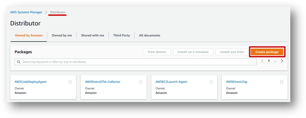 Na console AWS é possível encontrar o Distributor dentro dos componentes do Systems Manager, na seção Node Management do menu esquerdo. Após isto, você verá diversos pacotes já existentes, fornecidos pela AWS ou até mesmo por terceiros.