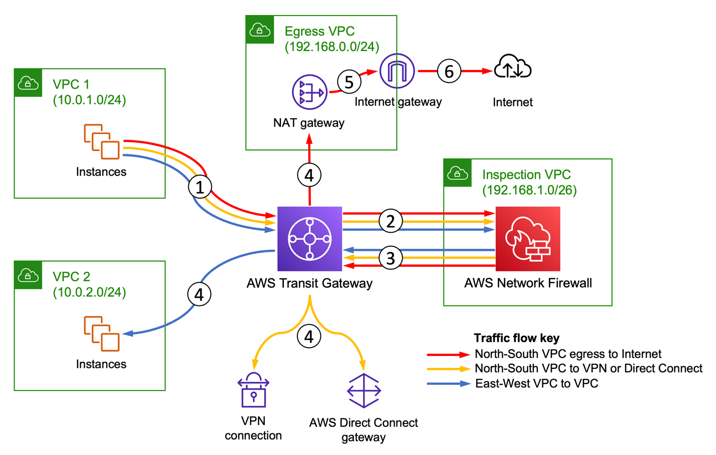 Uma segunda abordagem, é utilizar o AWS Network Firewall em um VPC de inspeção. Nesse cenário todo o tráfego de entrada e saída para o datacenter é enviado para a VPC de inspeção, inspecionado, e então enviado ao destino com base nas regras de firewall (statefull), filtros Web e IPS (do inglês, Intrusion Prevention System). Por se tratar de um serviço gerenciado pela AWS a principal vantagem é a escalabilidade que chega a 100Gbps de largura de banda por endpoint, podendo escalar ainda mais através da criação de endpoints adicionais em outras subnets. É recomendada a utilização de endpoints distintos nas diferentes Zonas de Disponibilidade que compõem uma Região da AWS. A utilização do AWS Network Firewall ajuda na redução de custos de um NAT Gateway e adiciona uma camada de proteção e inspeção de tráfego para a internet através de alguns modelos de implementação.