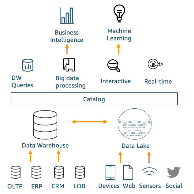 A ideia por trás dos Data Lakes é que as empresas armazenem e utilizem dados importantes de qualquer fonte que tenham (CRMs, ERPS, Sites, Aplicativos móveis, dispositivos móveis, sensores, etc.) no volume que necessitarem, na velocidade que os dados sejam gerados, e que esses dados sejam acessíveis para realizar análises exploratórias importantes para o negócio.
