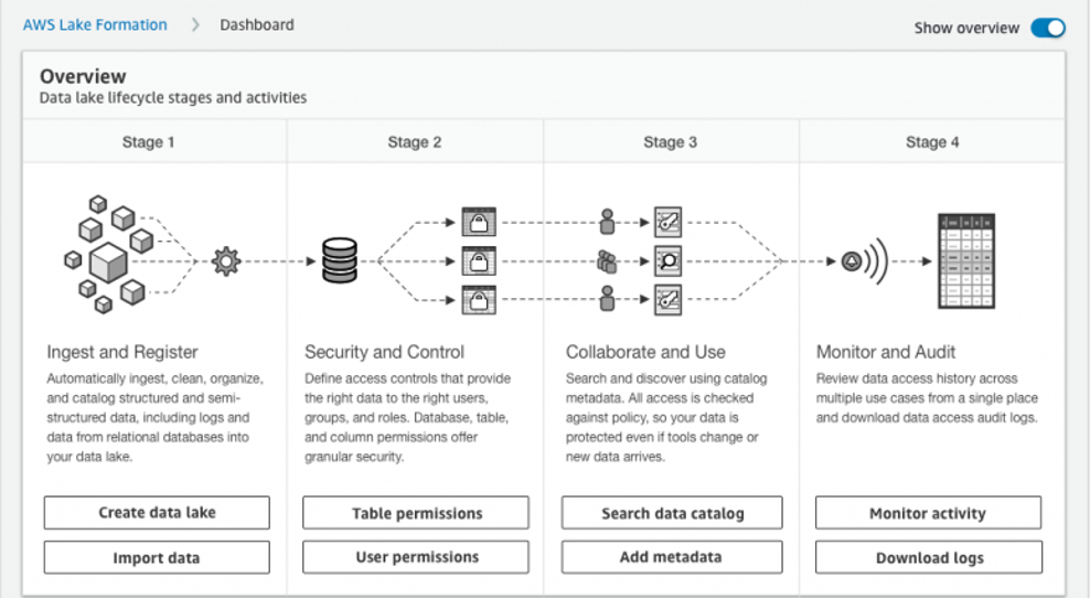 Desde a ingestão, preparação e uso dos dados, o Lake Formation adiciona controles e gestão de acesso granular, a nível de coluna e monitoramento de operações para troubleshooting e auditoria.