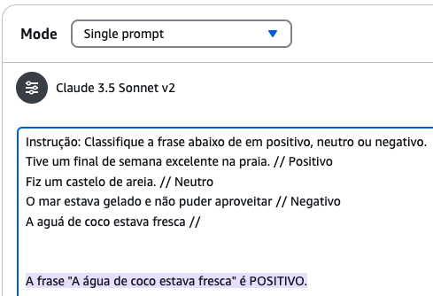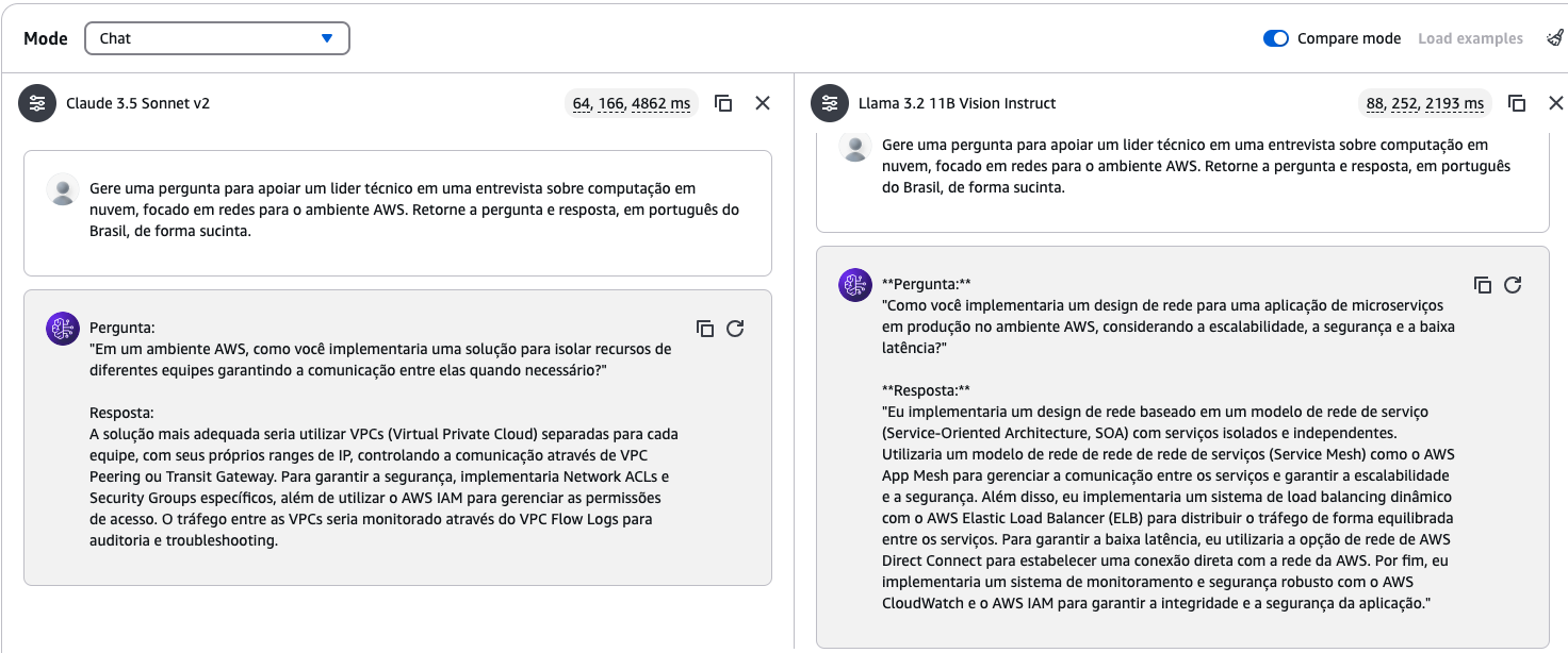 Uma boa estratégia é testar com diferentes modelos. A propósito, trocar de modelos facilmente é uma das grandes vantagens do Amazon Bedrock. Uma forma de fazer isso é usando o próprio playground no Console da AWS. Ao ativar seu modelo em “Model Access”, você pode ir na opção de “Chat”. Nela, no canto superior direito, existe uma opção “Compare mode” que, quando ativada, permite selecionar um novo modelo. Ao digitar um comando, você verá a mesma resposta gerada pelos dois modelos selecionados. Na parte superior direita você verá informações de métricas do modelo, que irá lhe mostrar não só o tempo despendido para a resposta, como a quantidade de tokens inseridos e devolvidos, facilitando futuros cálculos.
