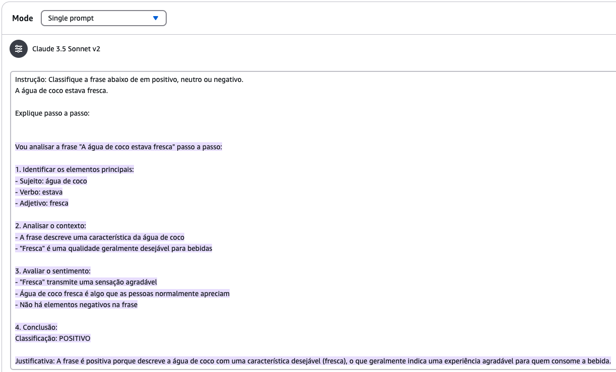 - Chain of Thoughts (CoT): ou cadeia de pensamentos, é quando o modelo explica em como ele chegou naquele resultado.