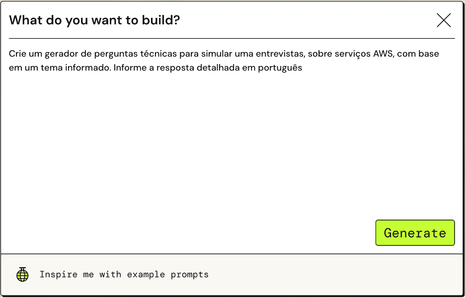 Não há problemas, recomendamos que experimente soluções como o PartyRock. Aqui é possível criar sua primeira aplicação de IA Generativa de forma divertida e prática apenas escrevendo o que espera que ela faça.
