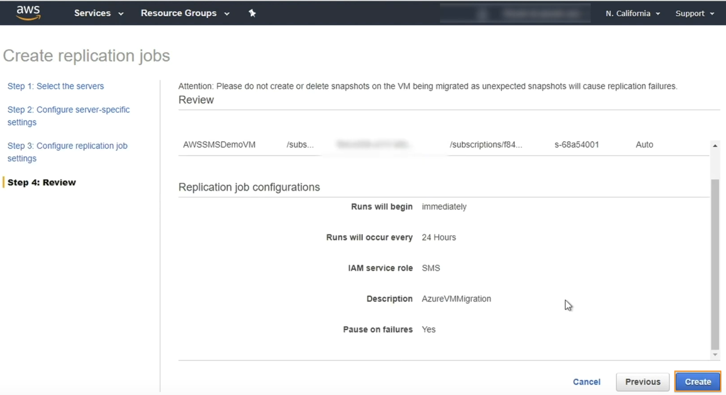 - Na página Review, revise as configurações e atualize-as conforme necessário. Quando terminar, selecione Create. Depois que a tarefa de replicação é configurada, a replicação é iniciada automaticamente no horário especificado e irá se repetir no intervalo especificado.
