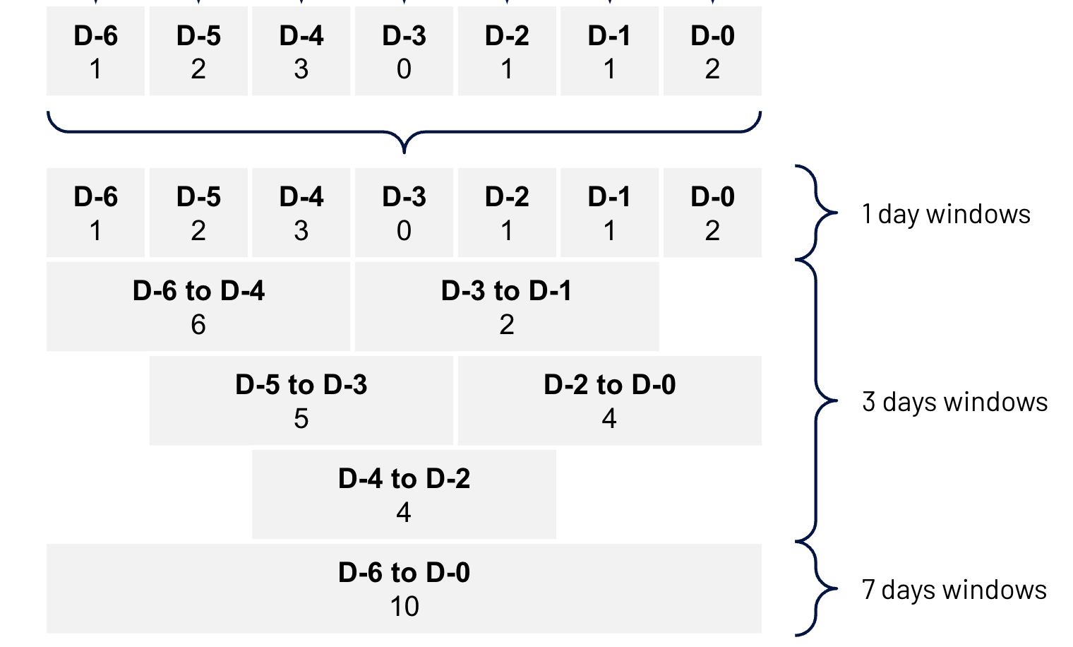 Imagem 3: Exemplo com três janelas distintas sendo calculadas a partir da mesma sequência de janelas menores, ou seja, cada janela é na verdade a soma de um conjunto menor de janelas intermediárias.