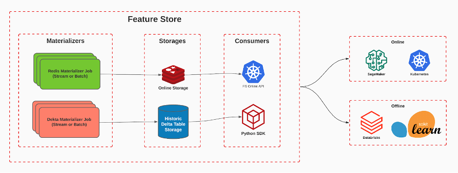 Imagem 4: Arquitetura interna da Feature Store, onde cada materializador é responsável por salvar em seu respectivo armazenamento. E também cada armazenamento possui um consumer específico, para as features em real-time temos uma API REST e para o histórico temos uma SDK em python para buscar os dados históricos.