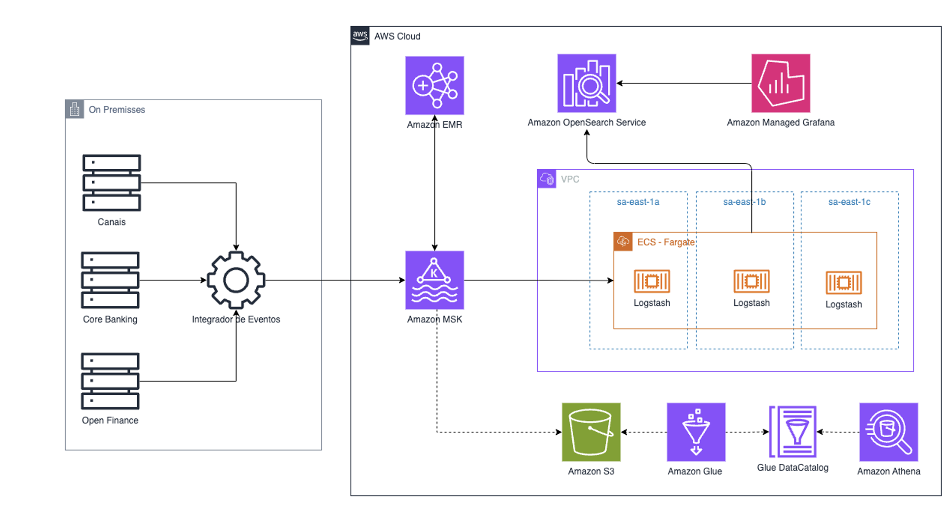 Tendo como meta o desenvolvimento de uma nova plataforma de monitoração que endereçasse as preocupações existentes, visando também modernizar este ambiente com o uso de tecnologias modernas e que permitisse integrar com as rotinas de Business Inteligence (BI), reduzindo o time to market de novas implementações de maneira ágil e segura, foi desenhada uma arquitetura composta pelo Amazon MSK, Amazon EMR, Amazon S3, Amazon OpenSearch Service, Amazon ECS e Amazon Managed Grafana.