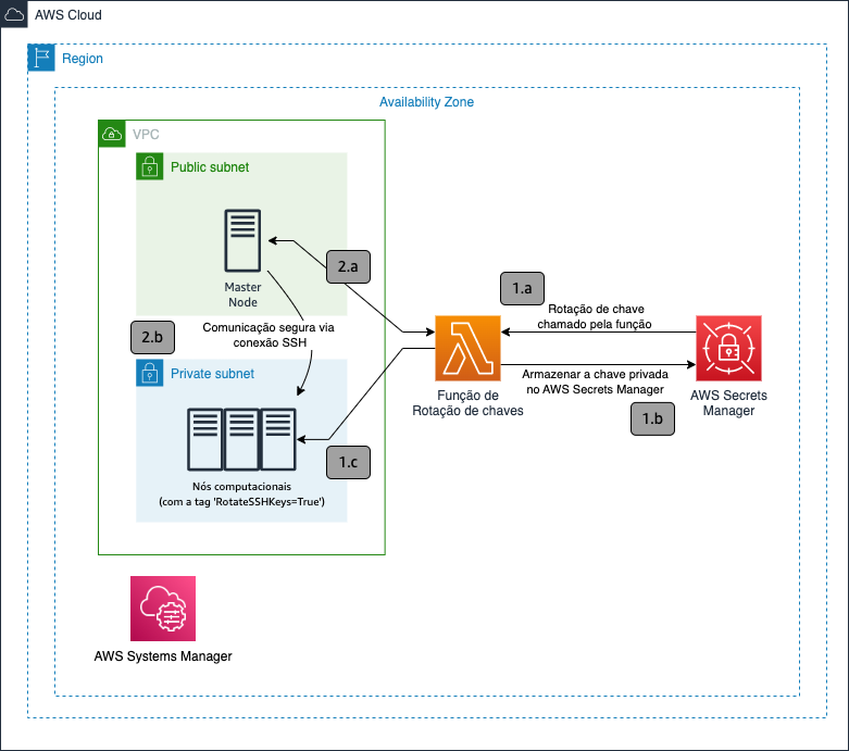 - O segredo é criado no AWS Secrets Manager. O segredo contém a chave SSH que o nó principal utilizará para se conectar nos outros nós do cluster. Após a rotação da chave SSH, o AWS Secrets Manager irá executar a função Lambda (nomeada 1.a no diagrama). A função Lambda irá executar quatro passos: