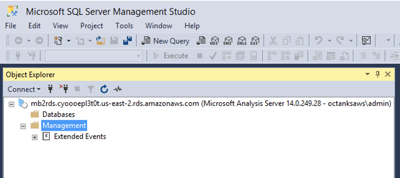 - Inicie uma sessãodo “SQL Management Studio” a partir de qualquer servidor que atinja a instância do RDS para o SQL Server.