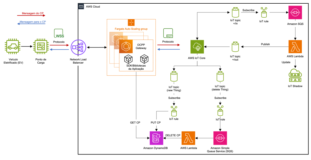 O cliente MQTT implementado pelo Gateway OCPP reconhece conexões WebSocket e fornece uma associação única entre a subscrição MQTT e o CP. Todas as mensagens iniciadas pelo CPO são entregues ao cliente MQTT associado ao CP de destino e encaminhadas via WebSocket a este CP. Por ser altamente elástico, o AWS IoT Core será facilmente escalado à medida que mais CPs forem integrados.