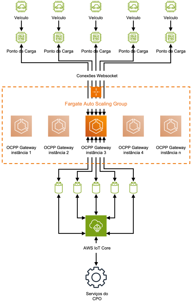 Por ser um serviço totalmente gerenciado e altamente elástico, o AWS IoT Core irá escalar para suportar milhões de conexões e coisas (Things). O Gateway OCPP, por sua vez, utiliza auto-scaling para escalar automaticamente e aumentar o número de tasks à medida que sua frota de CPs cresce.