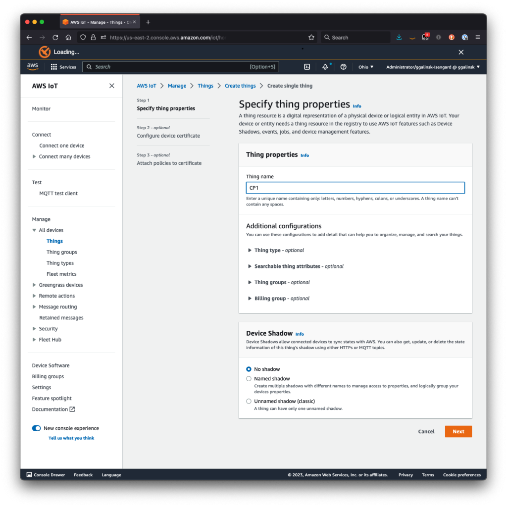 Observação: Cada ponto de carga de EV deve ser mapeado para uma única coisa (IoT Thing). Para nosso teste, definiremos o Thing Name como CP1.