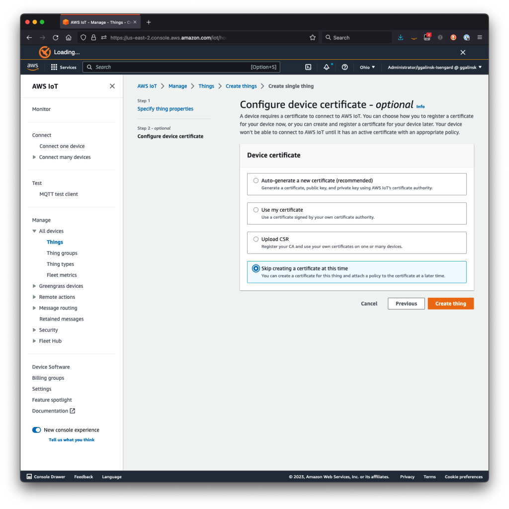 - Para o Certificado de dispositivo, selecione Skip creating a certificate at this time (Ignorar a criação de um certificado neste momento) e escolha Create thing.