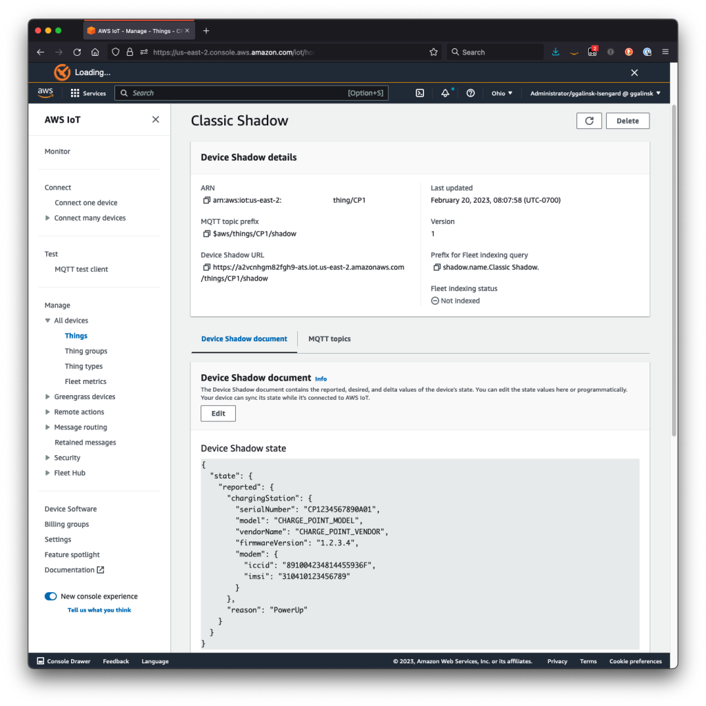 Quando um CP envia uma notificação de inicialização BootNotification, seus atributos de hardware são armazenados em um Device Shadow associado ao IoT Thing. Você pode ver esses atributos na console.
