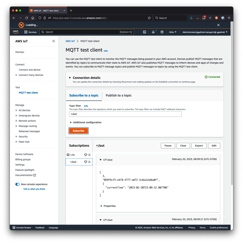 Tanto as mensagens originadas pelo CP, quanto as destinadas ao CP são intermediadas por meio do AWS IoT Core. Essas mensagens utilizam o protocolo publish-and-subscribe MQTT. Você pode ver essas mensagens na console.