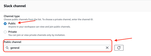 A próxima sessão é a “Slack channel”. Você deverá selecionar o tipo de canal (Público ou Privado) e selecionar o canal no próximo campo.