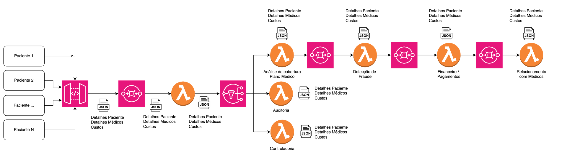 Um possível desafio de usar a proteção de dados de mensagens do Amazon SNS é que, embora a criptografia proteja a privacidade e a segurança de todos ou de parte dos dados no processo de solicitação de reembolso, ela também pode tornar os dados inutilizáveis (desidentificação ou embaralhamento das informações) para outras etapas de processamento automatizado. Isso significa que, depois que os dados são ofuscados para fins de segurança, os sistemas que realizam tarefas como processamento de pagamentos ou gerenciamento de relações médicas podem não conseguir acessar ou interpretar as informações criptografadas sem os mecanismos de descriptografia adequados, o que pode aumentar a complexidade do fluxo de trabalho.