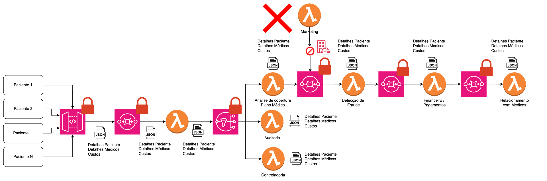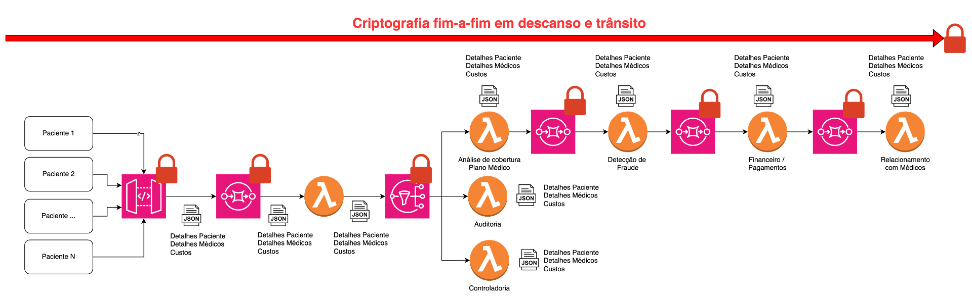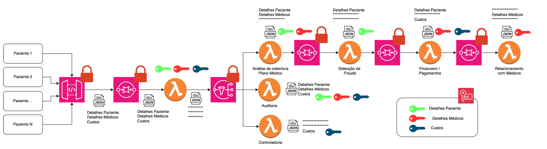 No início do fluxo, podemos ter uma função do AWS Lambda criptografando cada parte dos dados usando chaves de criptografia diferentes. Em cada estágio da solicitação de reembolso, uma função específica do AWS Lambda processa o segmento de dados relevante e esses AWS Lambdas terão acesso específico às chaves que permitem a descriptografia dos dados que lhes são permitidos. Por exemplo, a função Lambda responsável por lidar com os detalhes do paciente teria acesso à chave KMS correspondente para descriptografar essas informações. Da mesma forma, outras funções do AWS Lambda utilizariam suas respectivas chaves para acessar e processar dados de despesas e custos médicos.