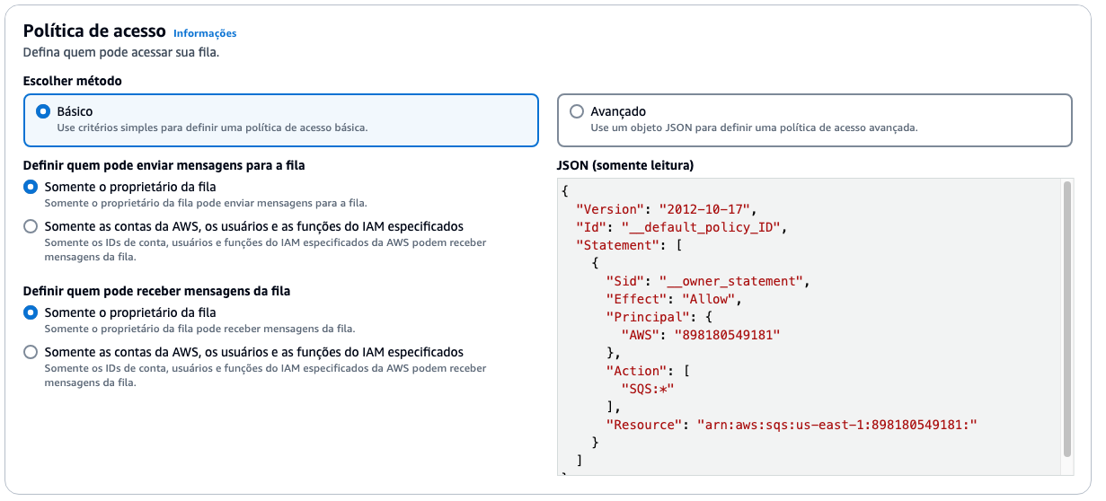 Figura 3: Configurando a política de acesso para filas do Amazon SQS usando o console da AWS