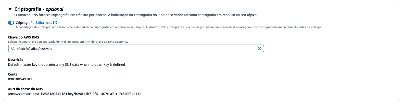 Embora o Amazon SQS e o Amazon SNS já ofereçam criptografia em trânsito por padrão, podemos adicionar outra camada de segurança à aplicação utilizando o AWS KMS na criptografia das mensagens também em repouso, o que garante que informações confidenciais permaneçam protegidas contra acesso não autorizado. A integração entre o AWS KMS, o Amazon SQS e o Amazon SNS fortalece a segurança dos dados nos aplicativos construídos na AWS, mantendo a integridade e a confidencialidade dos sistemas de mensagens e notificações, cruciais para criar aplicativos resilientes e seguros na nuvem.