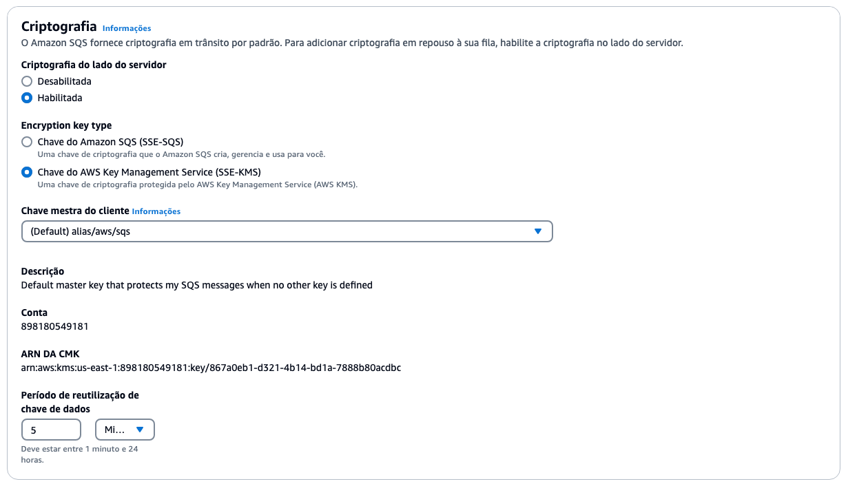 Por padrão, tanto o Amazon SNS quanto o Amazon SQS oferecem suporte à criptografia em repouso, também chamada server-side encryption (SSE) ou criptografia do lado do servidor. Isto garante que as mensagens sejam cifradas assim que o serviço as receba e assim permaneçam até que sejam entregues ou excluídas da fila ou tópico. Ao criar uma nova fila ou tópico, você deve especificar a chave do AWS KMS a ser usada para criptografia, conforme ilustrado, respectivamente, nas Figuras 1 e 2.