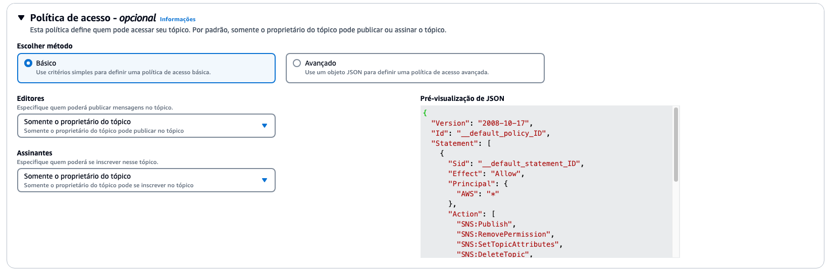 Figura 4: Configurando a política de acesso para tópicos do Amazon SNS usando o console da AWS
