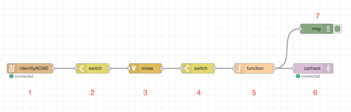 - O segundo Switch Node também age como um filtro, mas desta vez para filtrar as mensagens válidas. Ele deixa passar apenas as mensagens que possuírem o status = “valid”. Isso é necessário pois na inicialização do GPS USB (warm up period) ele envia uma série de mensagens inválidas (sem informação) e não queremos enviar esse tipo de informação ao AWS IoT Core.