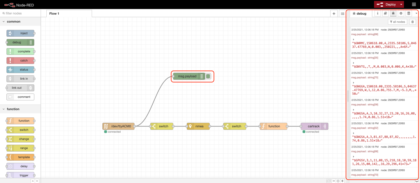 Posicionando o Debug Node na saída do Serial Node podemos ler os dados que estão sendo enviados pelo dispositivo GPS USB no formato NMEA (RAW), como mostro na figura abaixo:
