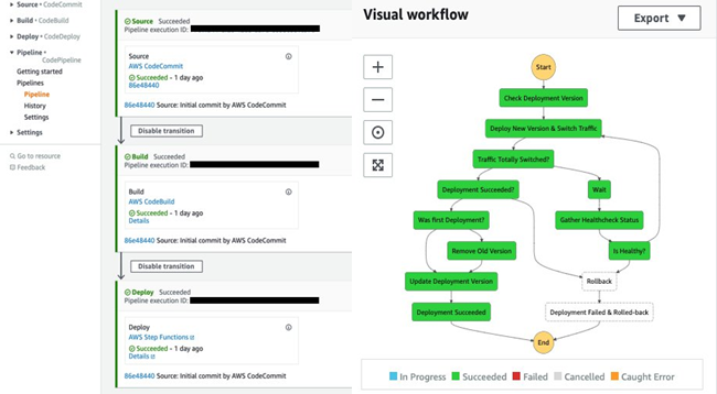 - A etapa Deploy aciona a máquina de estado do AWS Step Functions criada pela stack do AWS CloudFormation compartilhada. Você pode ver seu status clicando no link Detalhes.