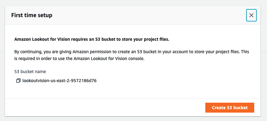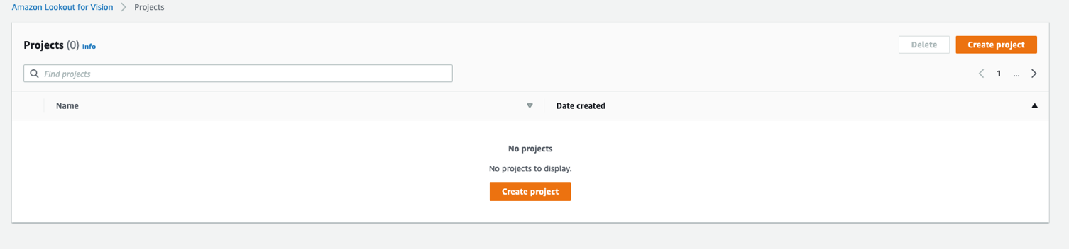 Para demostrar a funcionalidade via console, vamos usar imagens do arquivo dataset_reduzido.zip. Primeiro vamos até a página do Amazon Lookout for Vision, para esse post vamos utilizar a região Ohio (us-east-2), confirmamos a criação de um bucket do Amazon S3 para armazenar os arquivos e vamos clicar em “Create Project” para criarmos um projeto e iniciarmos nossa análise.