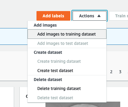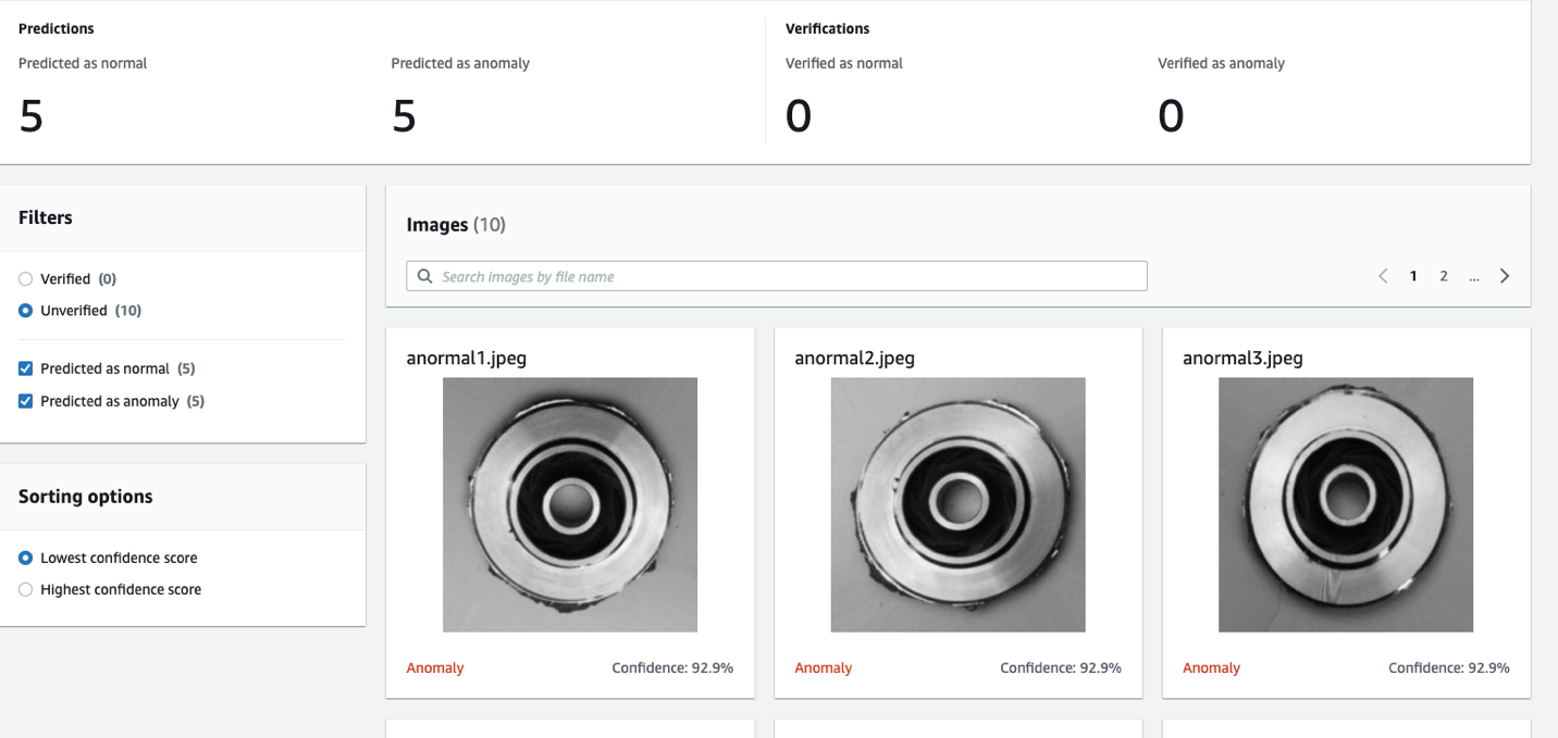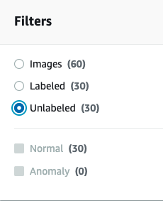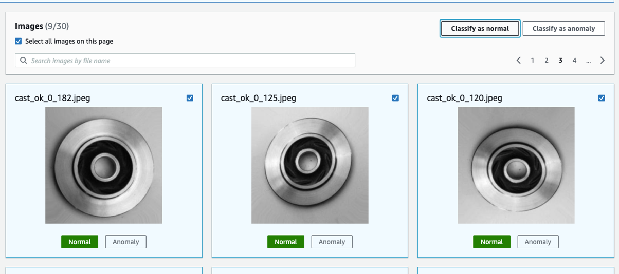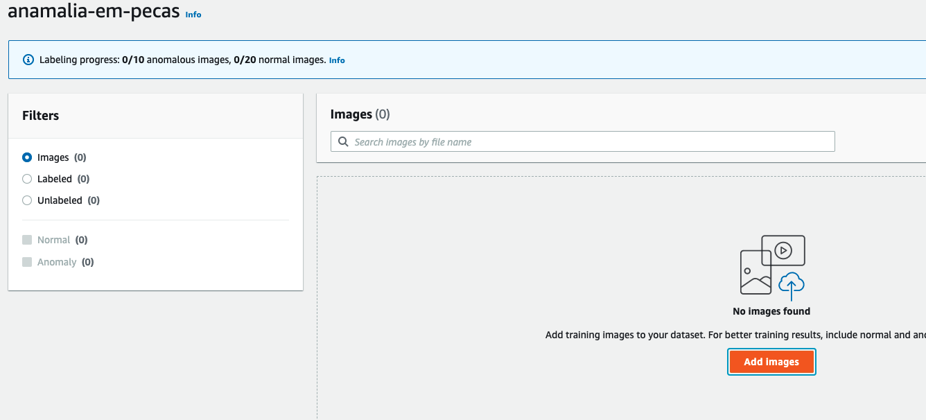 Agora realizaremos o mesmo processo para as peças consideradas defeituosas. Clique em “Actions”, “Add images to training dataset” e repetiremos o processo com a pasta anormal. Após upload concluído, selecionaremos “Unlabeled” no menu esquerdo, e repetiremos o processo de categorização navegando pelas páginas selecionando todas as imagens e clicando em “Classify as anomaly”.