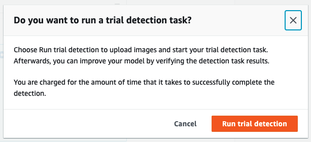 Após o treinamento do modelo finalizado podemos inspecionar a performance do modelo com os dados que enviamos ao serviço. Agora, vamos utilizar o modelo para fazer algumas detecções: clique em “Trial detections” e em “Run trial detection”, selecione as configurações como na imagem abaixo, os itens da pasta “validation” e clique em “Run trial detection”. Essa detecção pode demorar algum tempo.
