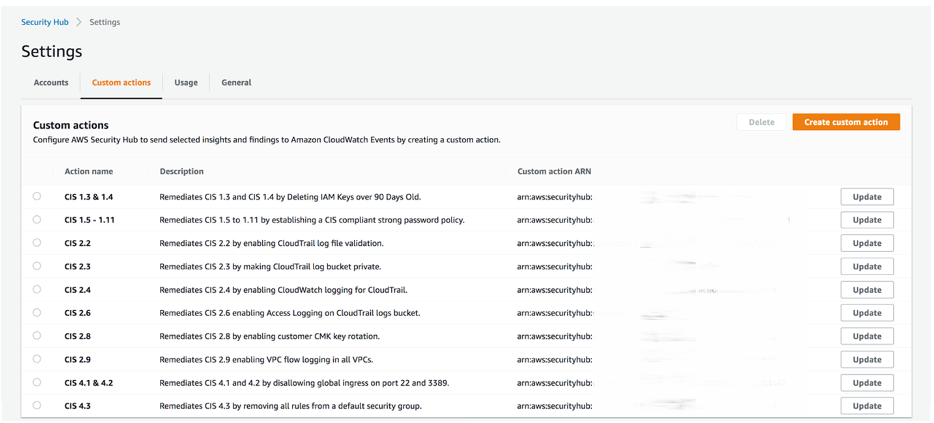- Ingestão: Logo após a detecção, é iniciada a parte do processamento e início do fluxo de trabalho dentro da solução. Os eventos do Amazon EventBridge (aka CloudWatch Events) serão acionados pelas customizações do Security Hub, na seção Custom Actions. Estes eventos servirão como gatilhos para Lambda Functions ou documentos de Automation do Systems Manager. Interessante notar aqui que os clientes podem definir se querem automatizar o processo de remediação, ou se querem manter manual.