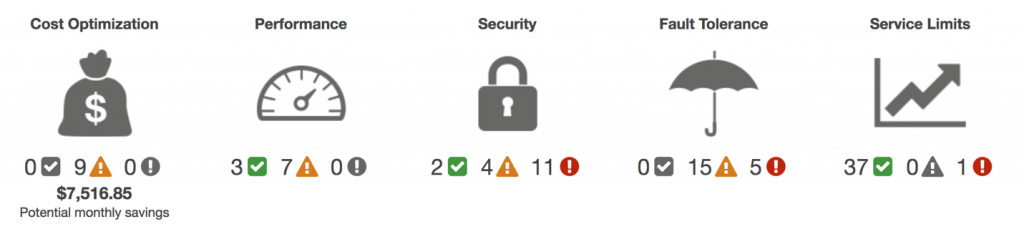 Ela oferece um conjunto de verificações em cinco categorias: otimização de custos, segurança, tolerância a falhas, desempenho e limites de serviços.
