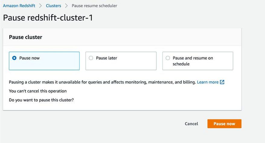 Você pode obter mais informações sobre essa funcionalidade no link (em inglês): https://docs.aws.amazon.com/redshift/latest/mgmt/managing-cluster-operations.html#rs-mgmt-pause-resume-cluster