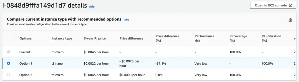 O EC2 Right Sizing Solution é uma ferramenta que realiza a análise do tamanho certo das instâncias de seu ambiente, oferecendo recomendações detalhadas sobre quais instâncias são mais efetivas em custo. Saiba mais em: https://aws.amazon.com/pt/answers/account-management/cost-optimization-ec2-right-sizing/.